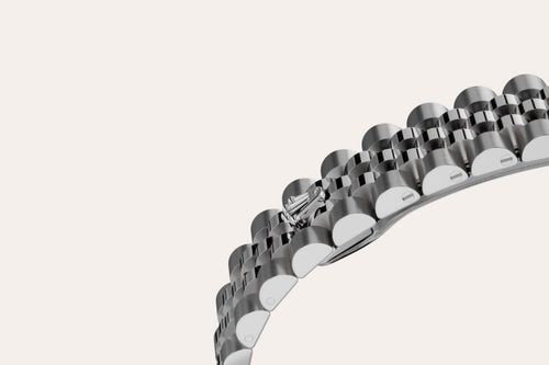 The design, development and production of Rolex bracelets and clasps, as well as the stringent tests they face, involve advanced high technology. And, as with all the components of the watch, aesthetic controls by the human eye guarantee impeccable beauty. The Jubilee, a supple and comfortable five-piece link metal bracelet, was designed and made especially for the launch of the Oyster Perpetual Datejust in 1945.