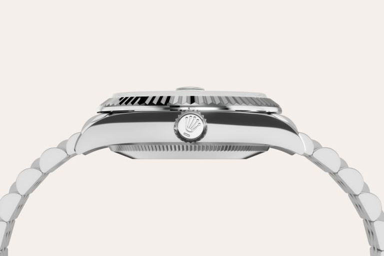The Rolex fluted bezel is a mark of distinction. Originally, the fluting of the Oyster bezel had a functional purpose: it served to screw the bezel onto the case helping to ensure the waterproofness of the watch. It was therefore identical to the fluting on the case back, which was also screwed onto the case for waterproofness, using specific Rolex tools. Over time, the fluting became an aesthetic element, a genuine Rolex signature feature. Today the fluted bezel is a mark of distinction, in gold on this Datejust 31.