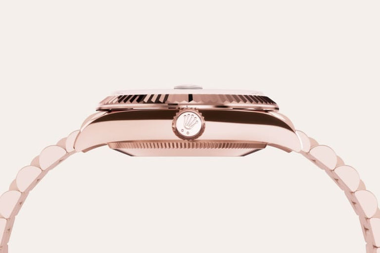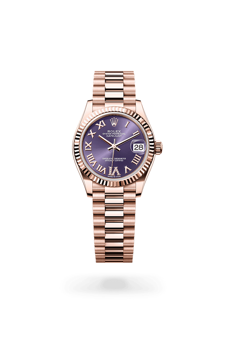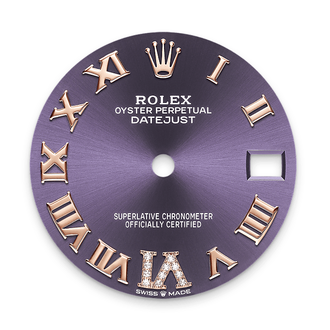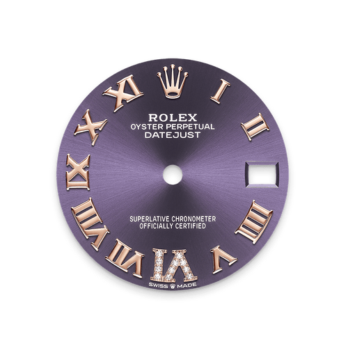 This dial features a large VI set with 11 diamonds. The sunray finish creates delicate light reflections on many dials in the Oyster Perpetual collection. It is obtained using masterful brushing techniques that create grooves running outwards from the centre of the dial. Light is diffused consistently along each engraving, creating a characteristic subtle glow that moves depending on the position of the wrist. Once the sunray finish has been completed, the dial colour is applied using Physical Vapour Deposition or electroplating. A light coat of varnish gives the dial its final look.