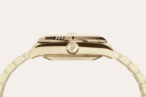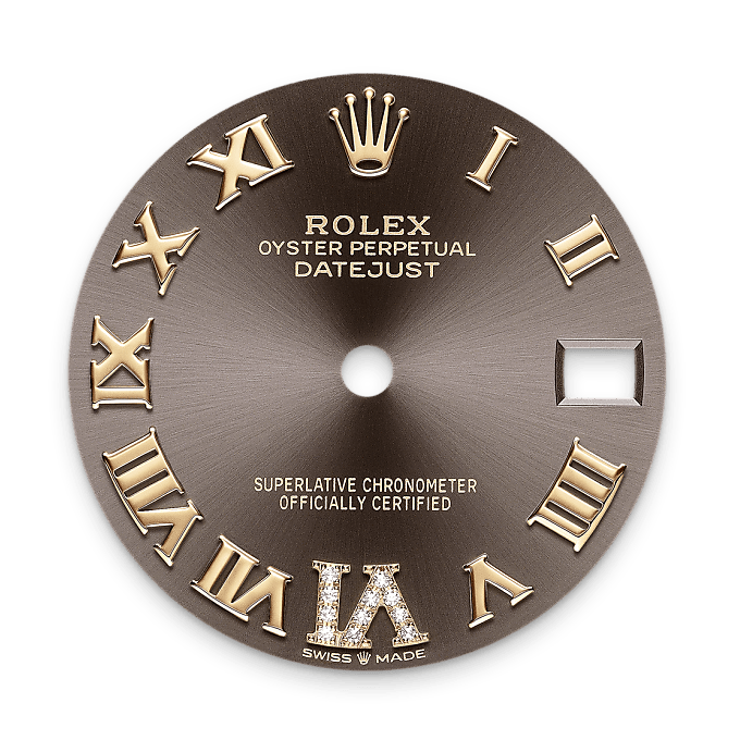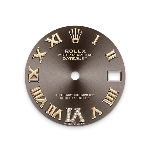 This dial features a large VI set with 11 diamonds. The sunray finish creates delicate light reflections on many dials in the Oyster Perpetual collection. It is obtained using masterful brushing techniques that create grooves running outwards from the centre of the dial. Light is diffused consistently along each engraving, creating a characteristic subtle glow that moves depending on the position of the wrist. Once the sunray finish has been completed, the dial colour is applied using Physical Vapour Deposition or electroplating. A light coat of varnish gives the dial its final look.