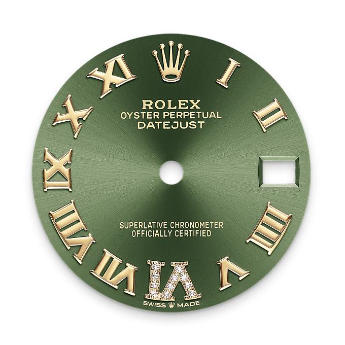 This dial features a large VI set with 11 diamonds. The sunray finish creates delicate light reflections on many dials in the Oyster Perpetual collection. It is obtained using masterful brushing techniques that create grooves running outwards from the centre of the dial. Light is diffused consistently along each engraving, creating a characteristic subtle glow that moves depending on the position of the wrist. Once the sunray finish has been completed, the dial colour is applied using Physical Vapour Deposition or electroplating. A light coat of varnish gives the dial its final look.