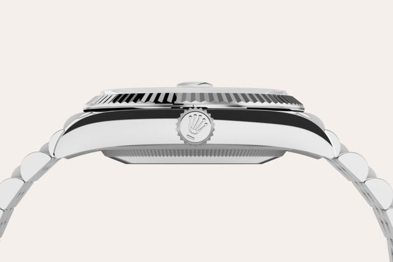 The Rolex fluted bezel is a mark of distinction. Originally, the fluting of the Oyster bezel had a functional purpose: it served to screw the bezel onto the case helping to ensure the waterproofness of the watch. It was therefore identical to the fluting on the case back, which was also screwed onto the case for waterproofness, using specific Rolex tools. Over time, the fluting became an aesthetic element, a genuine Rolex signature feature. Today the fluted bezel is a mark of distinction, in gold on this Datejust 36.