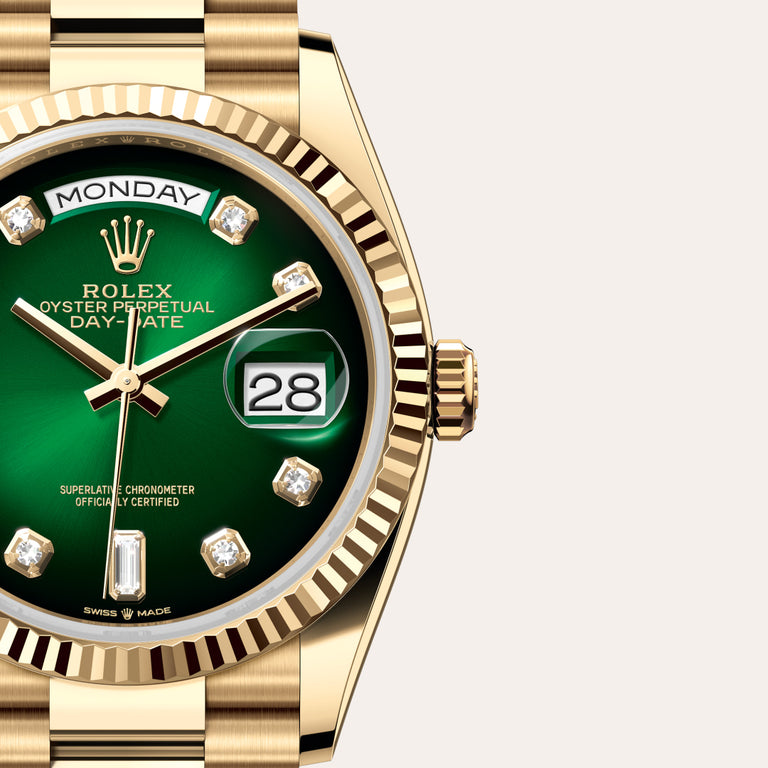 The Rolex fluted bezel is a mark of distinction. Originally, the fluting of the Oyster bezel had a functional purpose: it served to screw the bezel onto the case helping to ensure the waterproofness of the watch. It was therefore identical to the fluting on the case back, which was also screwed onto the case for waterproofness, using specific Rolex tools. Over time, the fluting became an aesthetic element, a genuine Rolex signature feature. Today the fluted bezel is a mark of distinction, in gold on this Day-Date 36.