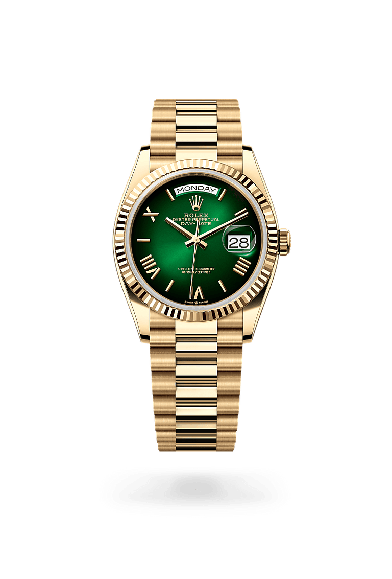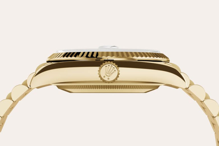 The Rolex fluted bezel is a mark of distinction. Originally, the fluting of the Oyster bezel had a functional purpose: it served to screw the bezel onto the case helping to ensure the waterproofness of the watch. It was therefore identical to the fluting on the case back, which was also screwed onto the case for waterproofness, using specific Rolex tools. Over time, the fluting became an aesthetic element, a genuine Rolex signature feature. Today the fluted bezel is a mark of distinction, in gold on this Day-Date 36.