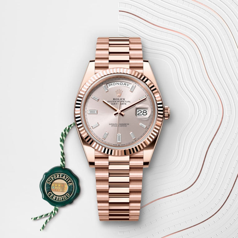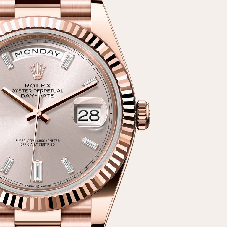 The Rolex fluted bezel is a mark of distinction. Originally, the fluting of the Oyster bezel had a functional purpose: it served to screw the bezel onto the case helping to ensure the waterproofness of the watch. It was therefore identical to the fluting on the case back, which was also screwed onto the case for waterproofness, using specific Rolex tools. Over time, the fluting became an aesthetic element, a genuine Rolex signature feature. Today the fluted bezel is a mark of distinction, in gold on this Day-Date 40.