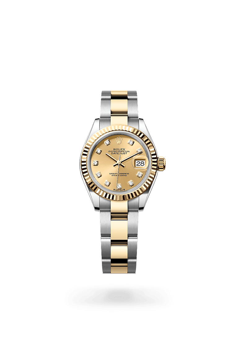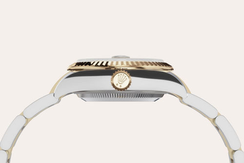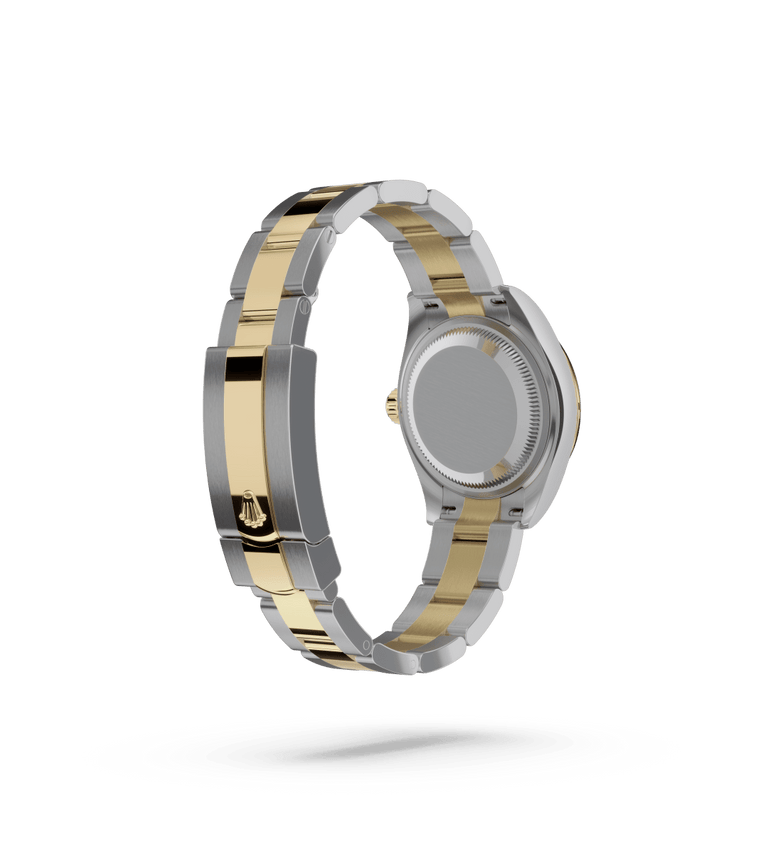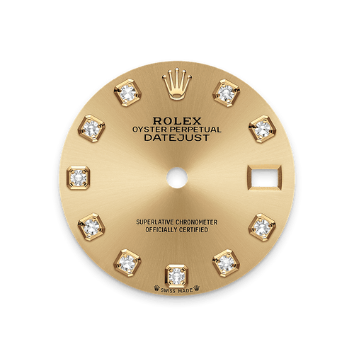 This dial features diamonds in 18 ct gold settings. The sunray finish creates delicate light reflections on many dials in the Oyster Perpetual collection. It is obtained using masterful brushing techniques that create grooves running outwards from the centre of the dial. Light is diffused consistently along each engraving, creating a characteristic subtle glow that moves depending on the position of the wrist. Once the sunray finish has been completed, the dial colour is applied using Physical Vapour Deposition or electroplating. A light coat of varnish gives the dial its final look.