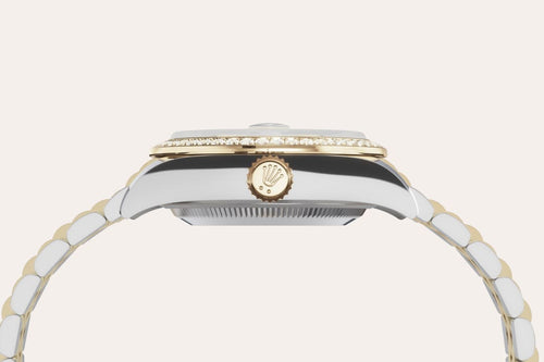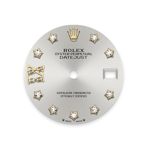 This dial features diamonds in 18 ct gold settings and a Roman IX in 18 ct gold, set with 8 diamonds. The sunray finish creates delicate light reflections on many dials in the Oyster Perpetual collection. It is obtained using masterful brushing techniques that create grooves running outwards from the centre of the dial. Light is diffused consistently along each engraving, creating a characteristic subtle glow that moves depending on the position of the wrist. Once the sunray finish has been completed, the dial colour is applied using Physical Vapour Deposition or electroplating. A light coat of varnish gives the dial its final look.