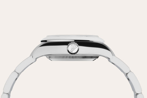 The Oyster bracelet is a perfect alchemy of form and function, aesthetics and technology. First introduced in the late 1930s, this particularly robust and comfortable metal bracelet with its broad, flat three-piece links remains the most universal bracelet in the Oyster collection. For the Oyster Perpetual models the Oyster bracelet is fitted with an Oysterclasp.