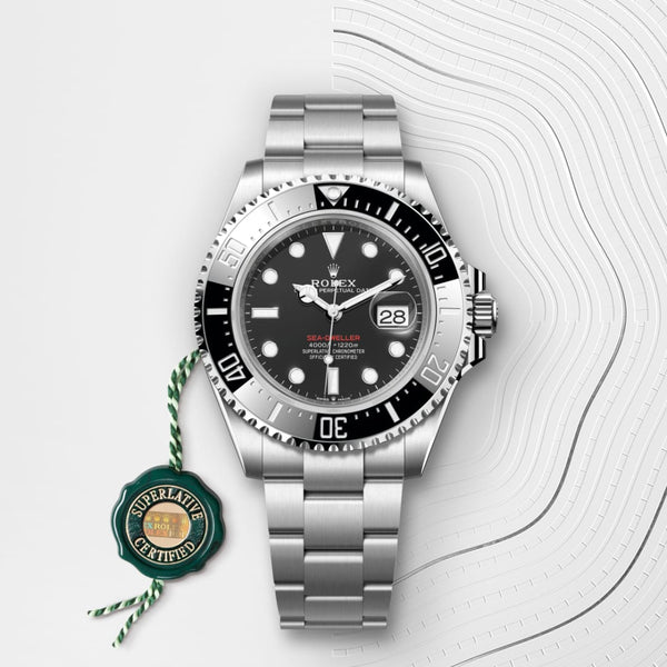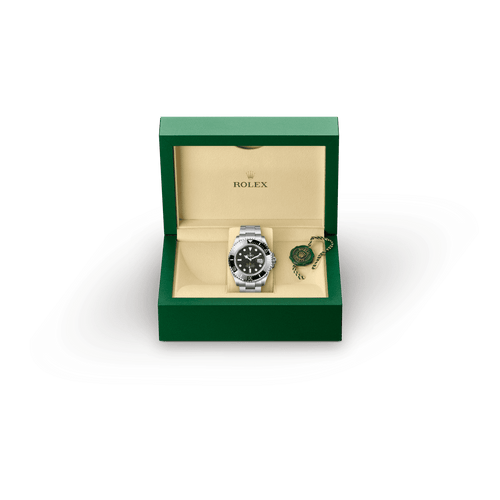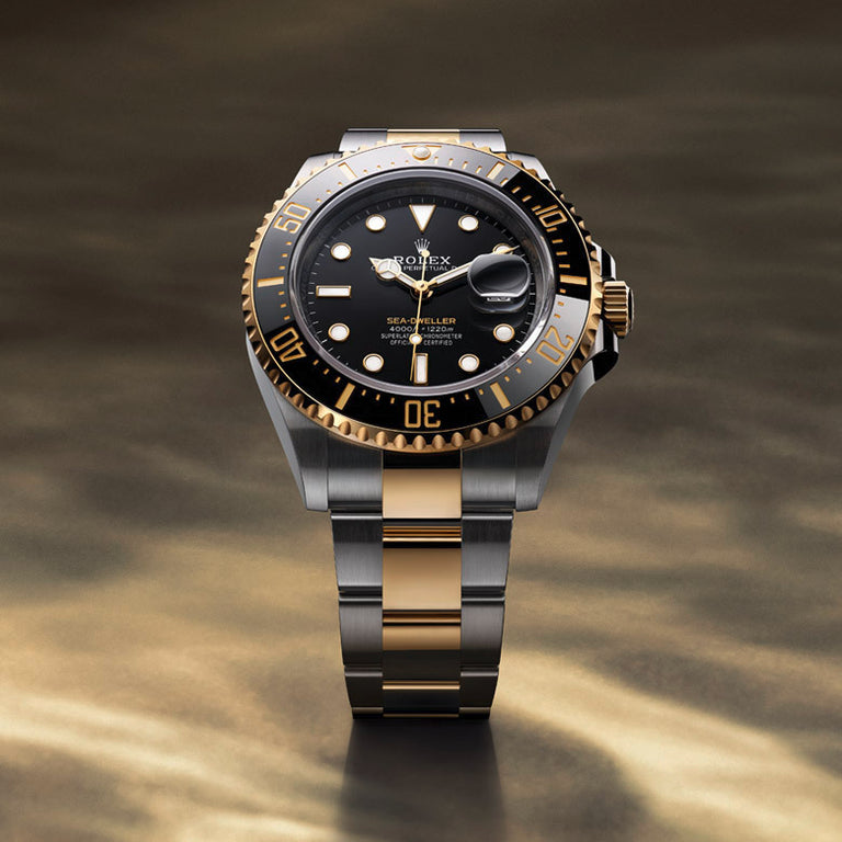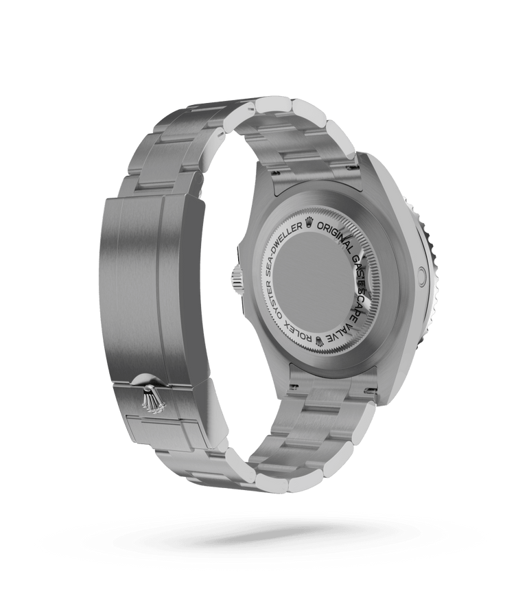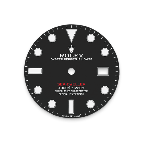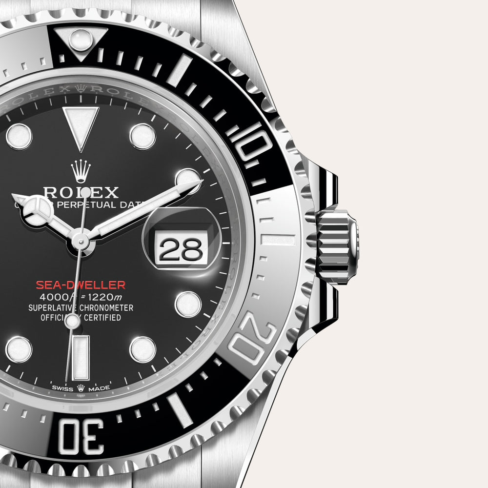 The 60-minute graduated, unidirectional rotatable bezel of the Sea-Dweller enables divers to precisely and safely monitor their dive and decompression times. It is equipped with a patented black Cerachrom bezel insert manufactured by Rolex in a virtually scratchproof ceramic whose colour is unaffected by ultraviolet rays. The graduation is coated via PVD (Physical Vapour Deposition) with a thin layer of platinum. The dial features large Chromalight hour markers and hands, filled with luminescent material that emits a long-lasting blue glow for excellent legibility in dark conditions.