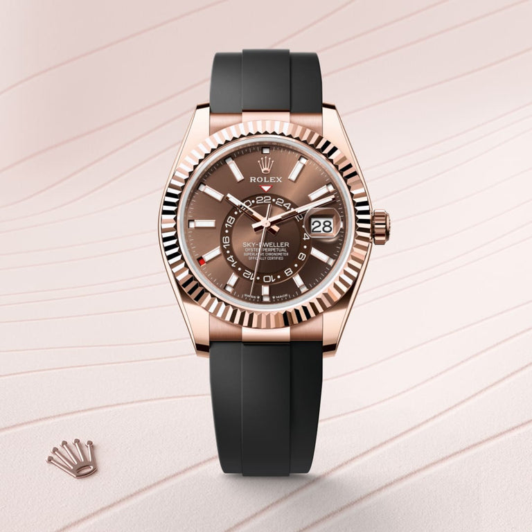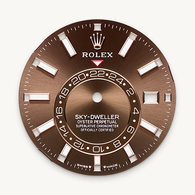 A fixed inverted red triangle on the dial points to the chosen reference time – the time at home or at the traveller’s usual workplace – on the off-centre 24-hour disc. At a glance, this 24-hour display clearly distinguishes daytime hours from night-time hours in the other time zone.