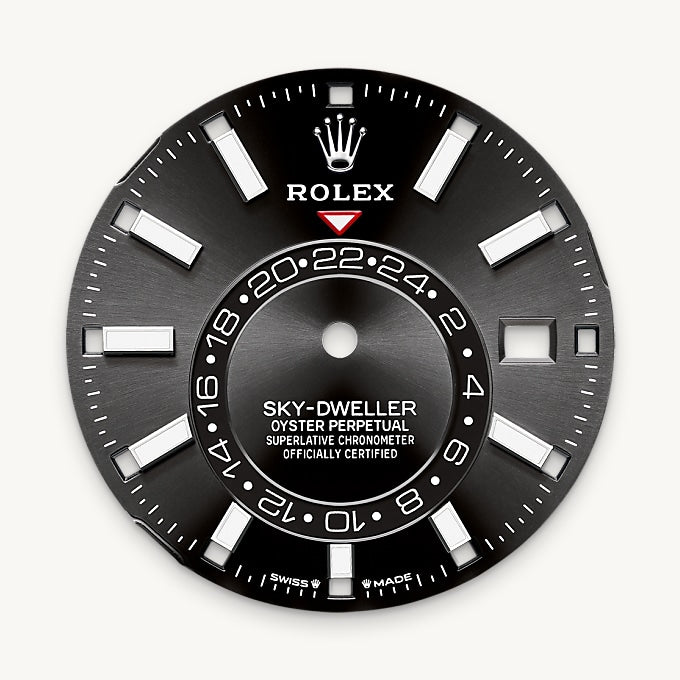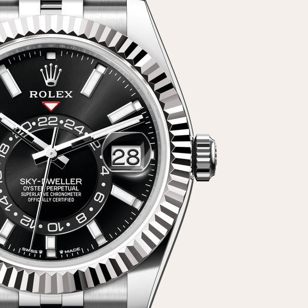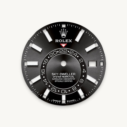 The Rolex fluted bezel is a mark of distinction. Originally, the fluting of the Oyster bezel had a functional purpose: it served to screw the bezel onto the case, helping to ensure the waterproofness of the watch. It was therefore identical to the fluting on the case back, which was also screwed onto the case for waterproofness, using specific Rolex tools. Over time, the fluting became an aesthetic element, a genuine Rolex signature feature. Today the fluted bezel is a mark of distinction, always in gold. The Sky-Dweller is equipped with a mechanism of interaction between the rotatable bezel, the winding crown and the movement: the Ring Command system, which allows the user to select the watch's functions one-by-one and to set them easily, quickly and securely.