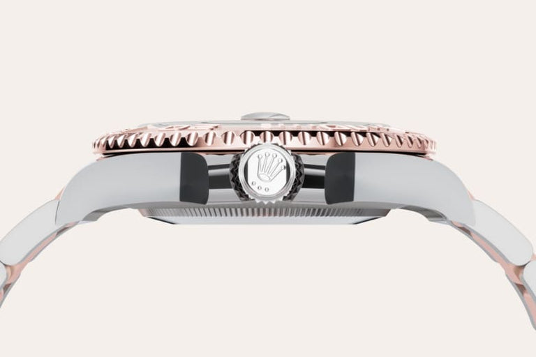 The Yacht-Master’s bidirectional rotatable 60-minute graduated bezel is made entirely from precious metals or fitted with a Cerachrom insert in high-tech ceramic. The raised polished numerals and graduations stand out clearly against a matt, sand-blasted background. This functional bezel – which allows the wearer to calculate, for example, the sailing time between two buoys – is also a key component in the model’s distinctive visual identity.