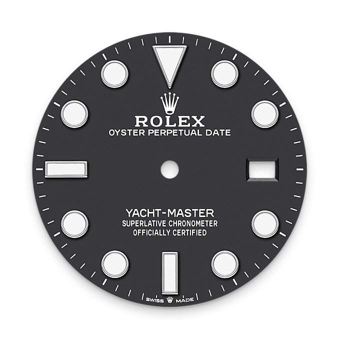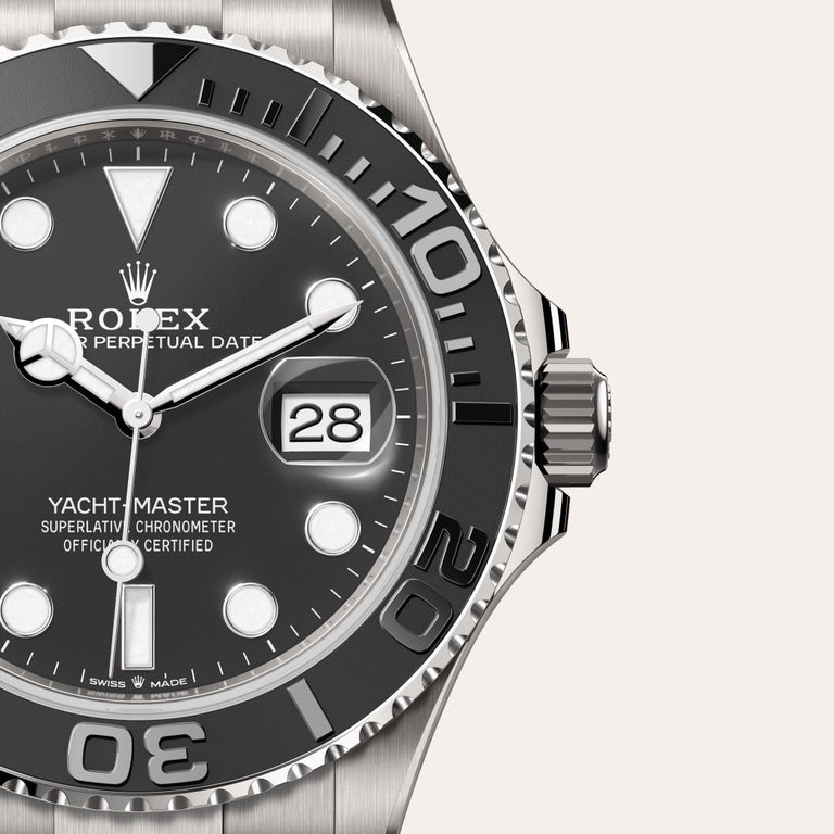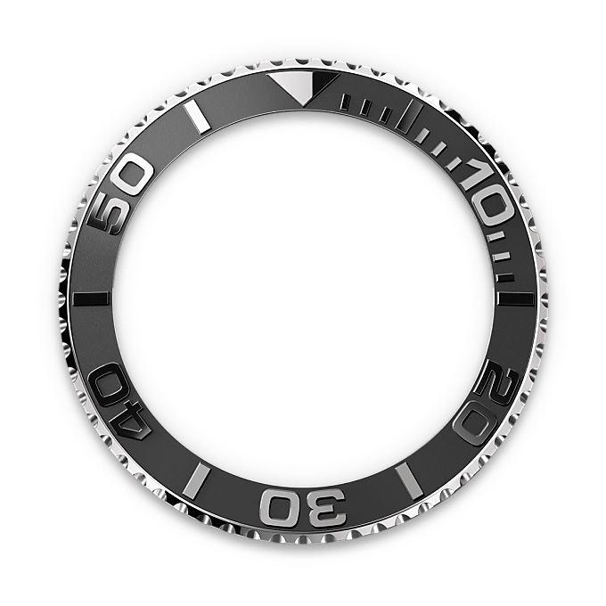 The Yacht-Master’s bidirectional rotatable 60-minute graduated bezel is made entirely from precious metals or fitted with a Cerachrom insert in high-tech ceramic. The raised polished numerals and graduations stand out clearly against a matt, sand-blasted background. This functional bezel – which allows the wearer to calculate, for example, the sailing time between two buoys – is also a key component in the model’s distinctive visual identity.