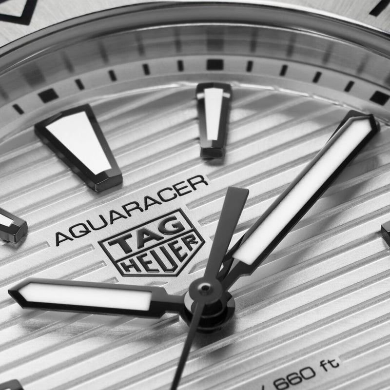TAG Heuer Aquaracer Steel 40mm Silver Baton Dial Watch with a Steel Rotating Bezel on a Brushed and Polished Steel...