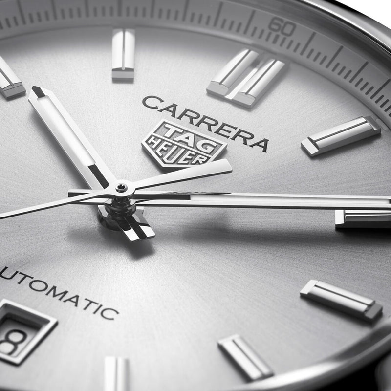 TAG Heuer Carrera Calibre 5 Steel Silver Baton Dial Watch with a Steel Polished Bezel on a Steel Bracelet
